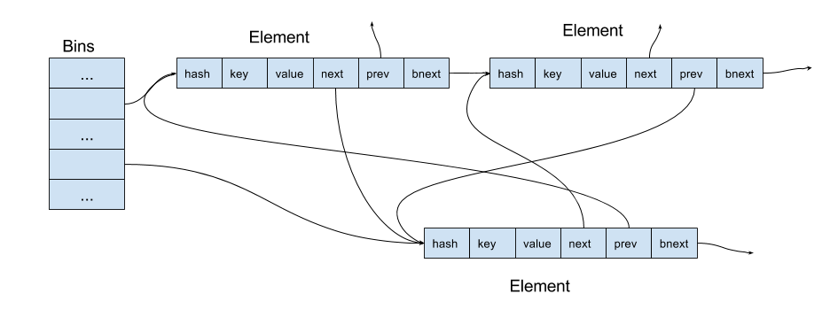 As you can see, entries have 3 pointers: two for a doubly linked list of entries in their order of inclusion and one for a list of entries corresponding the same bin (in other words, for colliding entries). Using a single linked list for collisions saves memory but makes deleting arbitrary entries during traversal, not a trivial task. So the actual Ruby hash table API is even more complicated than what I described.