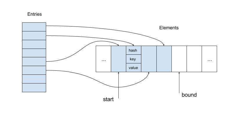 Bins provide access to entries by their keys. The key hash is mapped to a bin containing the index of the corresponding entry in the entry array (using an index instead of a pointer can be memory saving when we use 8-, 16- or 32-bit indices for reasonable size tables on 64-bit machines).