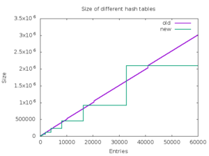 The average performance improvement on Intel Haswell for the proposed hash tables is about 46%. On ARM, it is even bigger 59%. The proposed implementation also consumes less memory in average than the old one. The below graph shows memory consumption in bytes on x86-64 depending on the number of entries in the hash table.