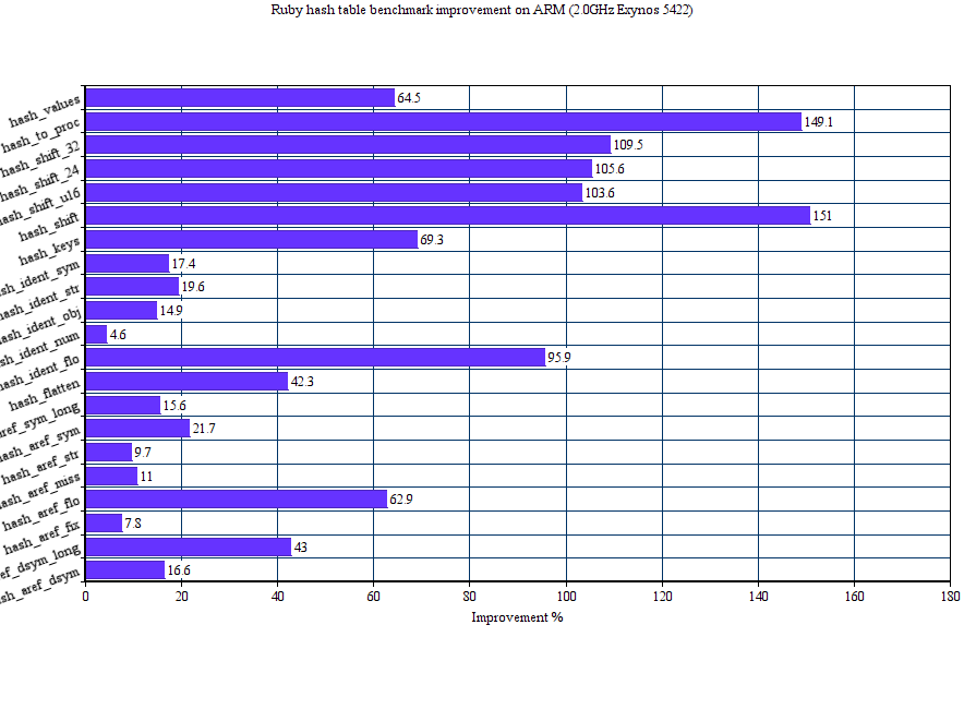 Here is the performance comparison of original and proposed hash tables on 27 MRI hash table benchmarks. We use two major targets for this: x86-64 and ARM.