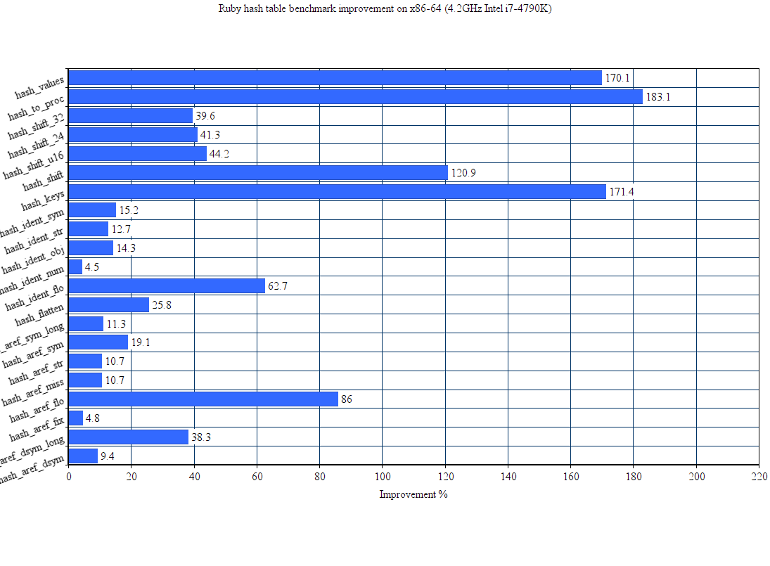 Hash tables are an important part of dynamic programming languages. They are widely used because of their flexibility, and their performance is important for the overall performance of numerous programs. Ruby is not an exception. In brief, Ruby hash tables provide the following API: