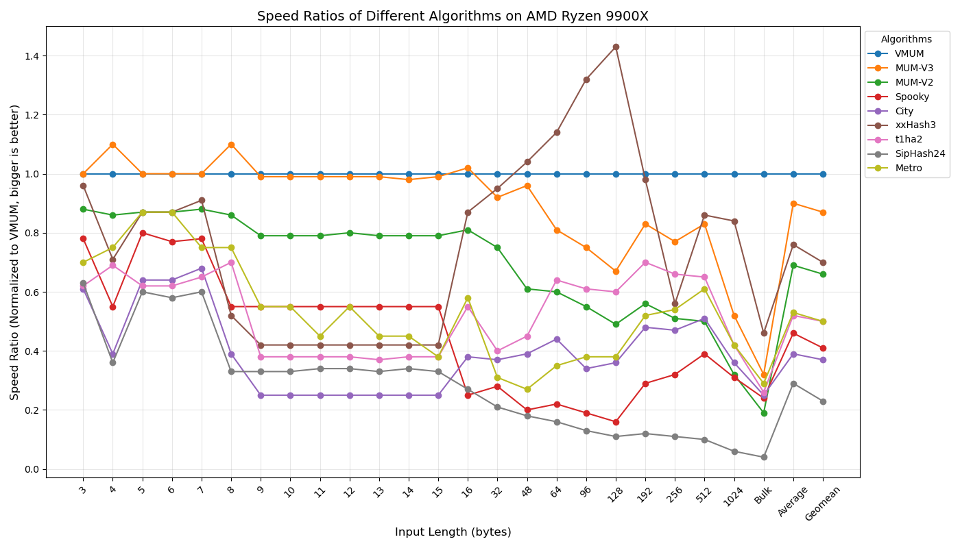 While speed is not the most important requirement for cryptographic hash functions, here is the speed of MUM512 on an AMD Ryzen 9900X, compared with SHA-2 and SHA-3 and SSE version of Blake2