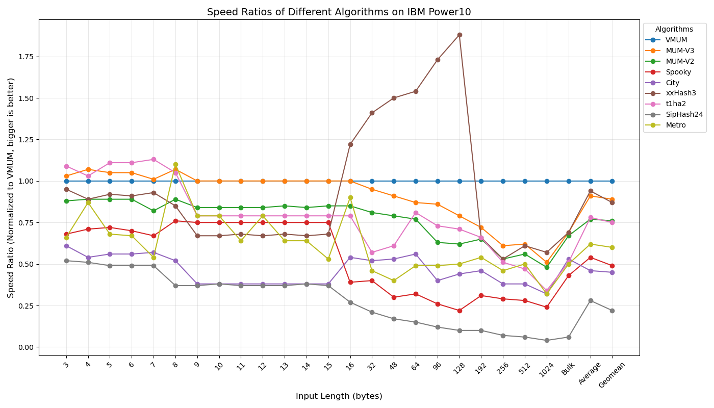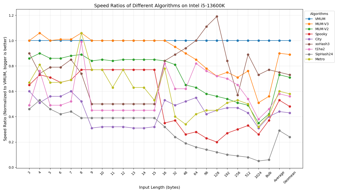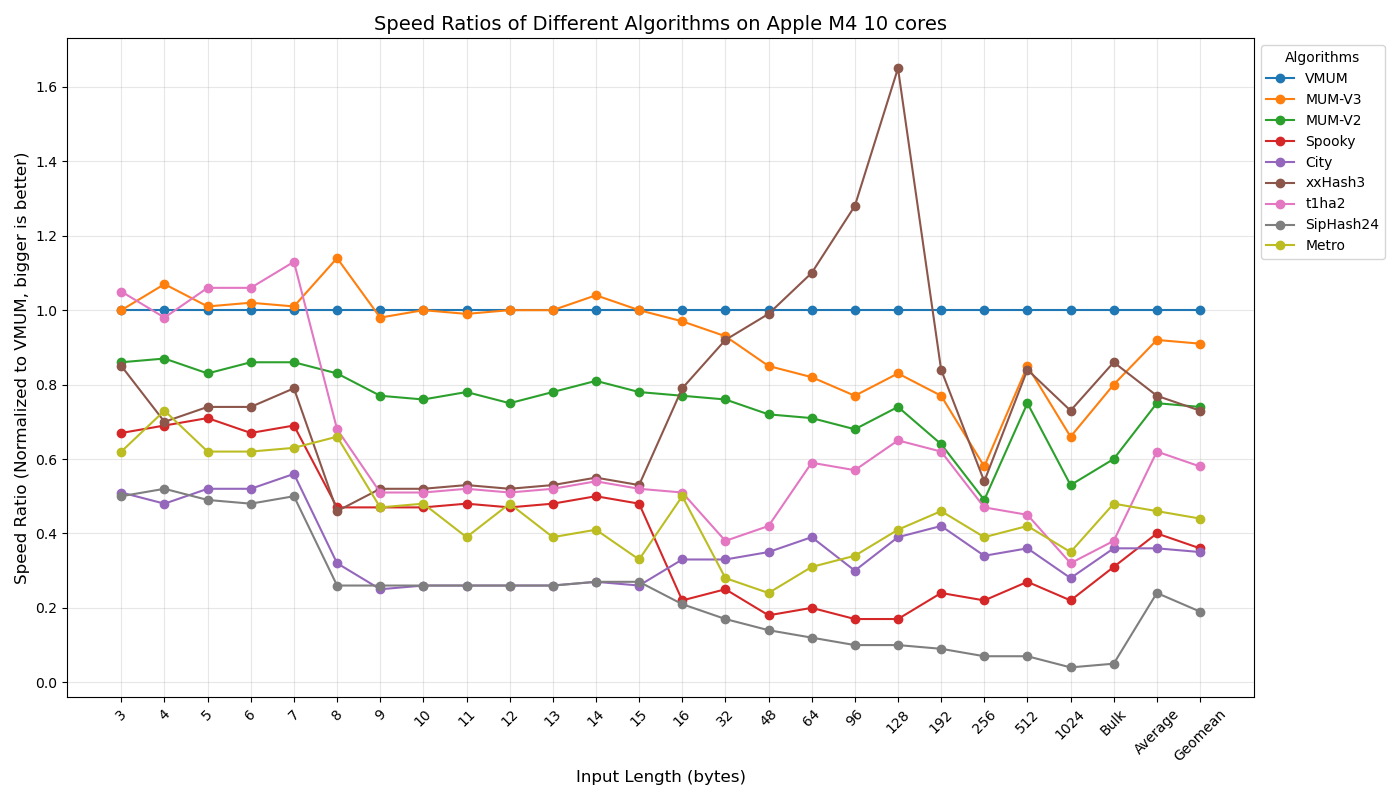 For comparison of MUM-based hash functions, I selected the fastest high-quality hash functions based on speeds measured by SMHasher.